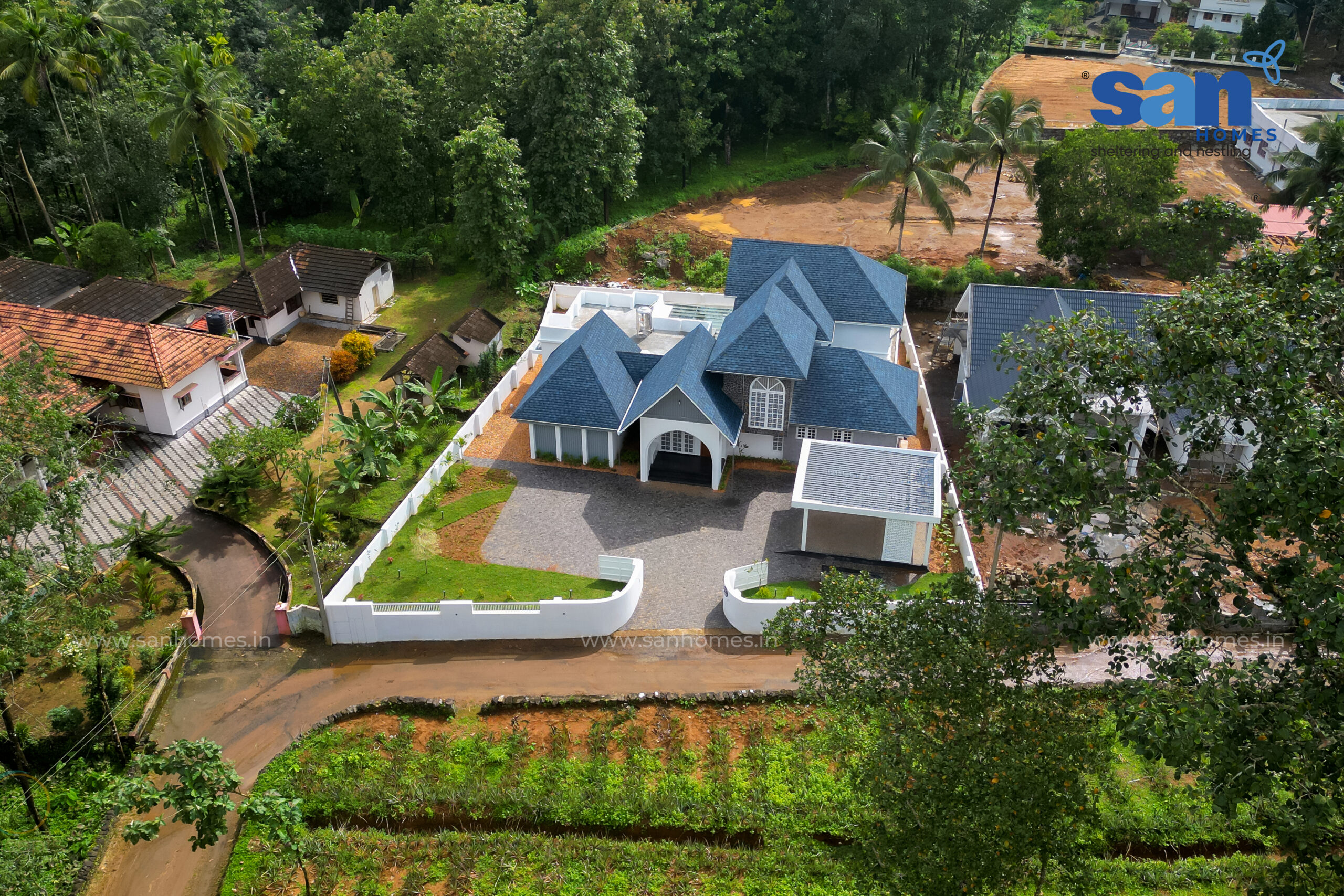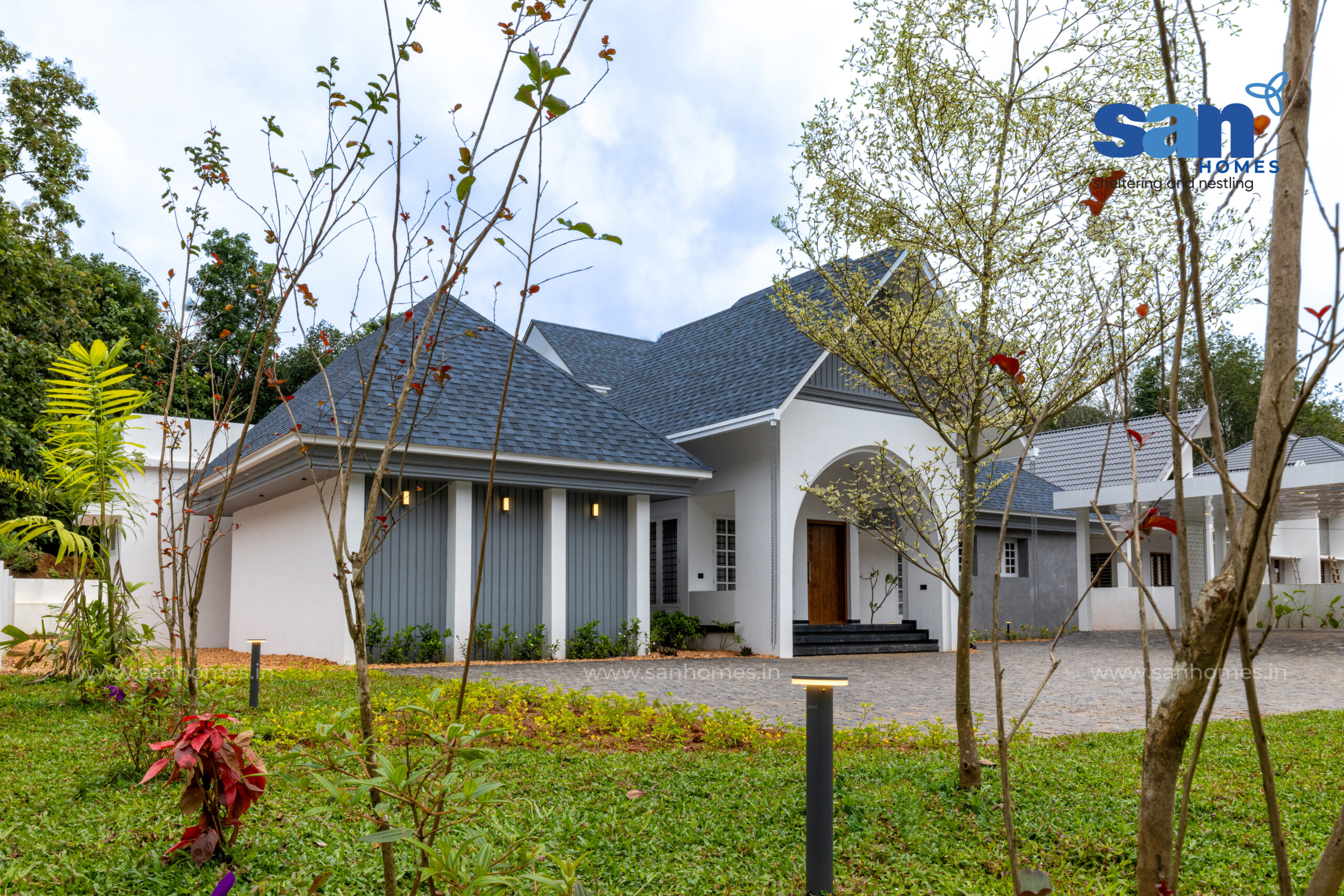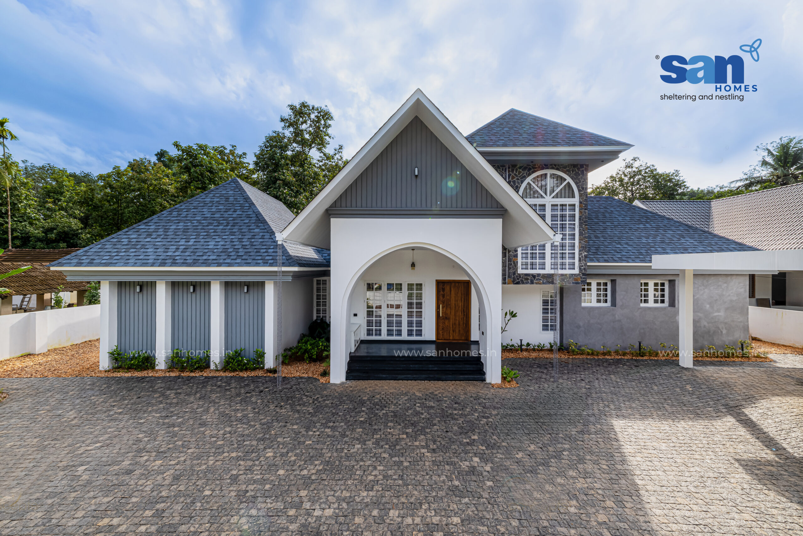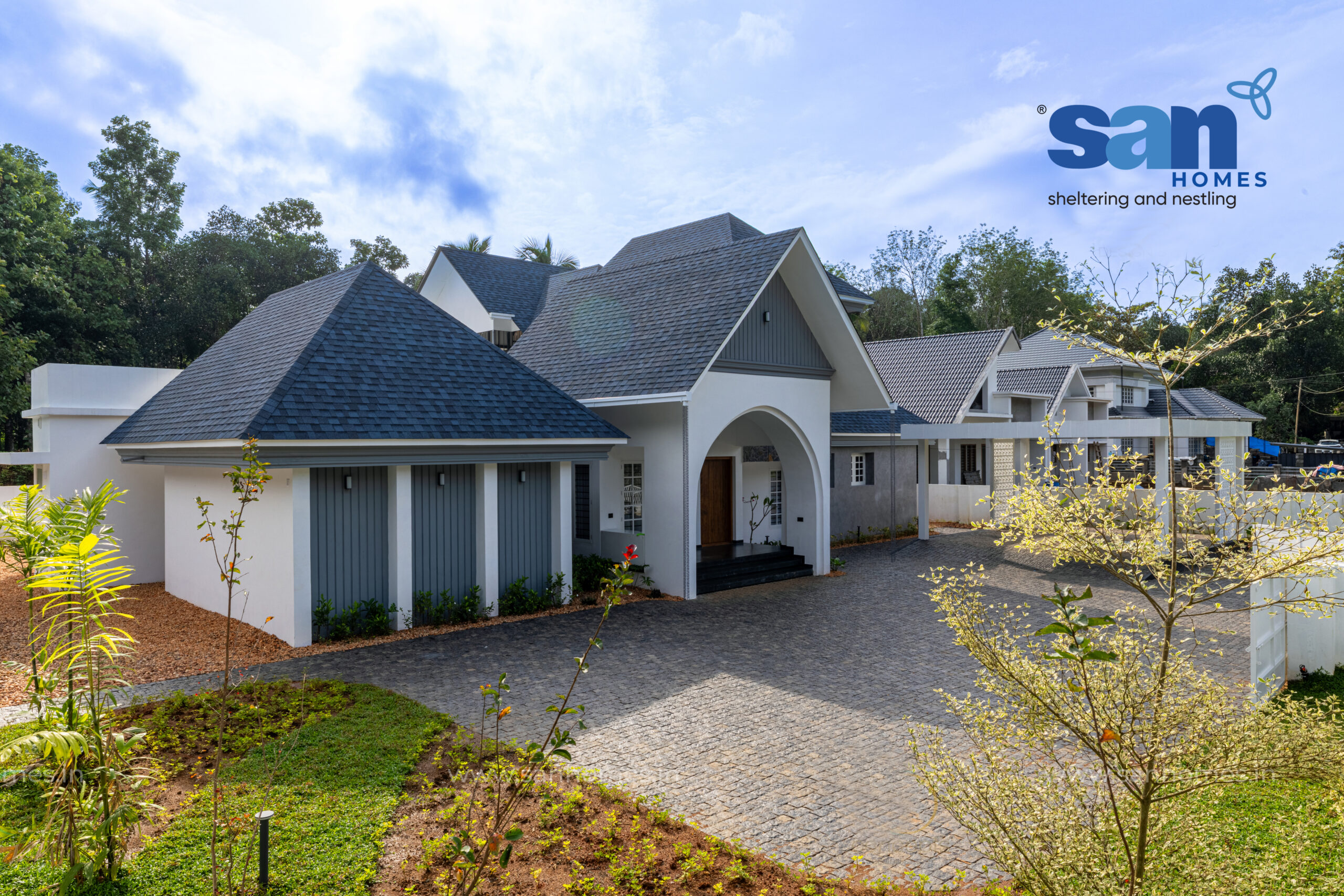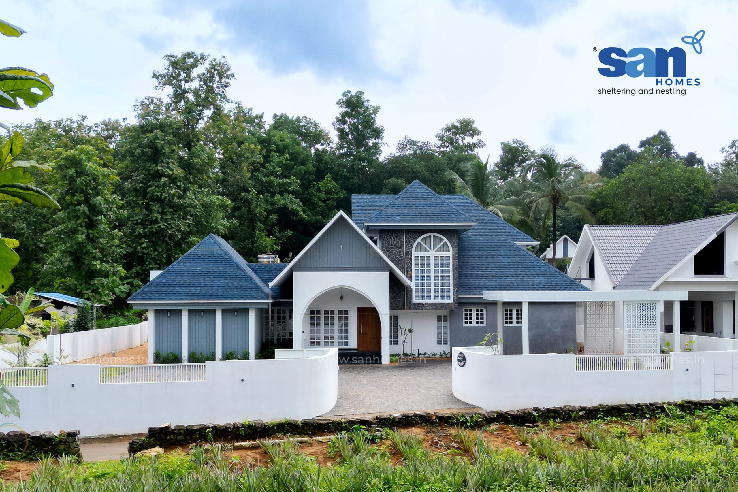 Presenting you.. Abin and Nibiya’s cocoon of life – AGNES that exudes #sanന്തോഷം through each walls, corners and spaces. Set on a 20-cent plot in Thodupuzha, this 2805 sqft 3BHK home blends European style with earthy tones, murals, and elegant stonework.
